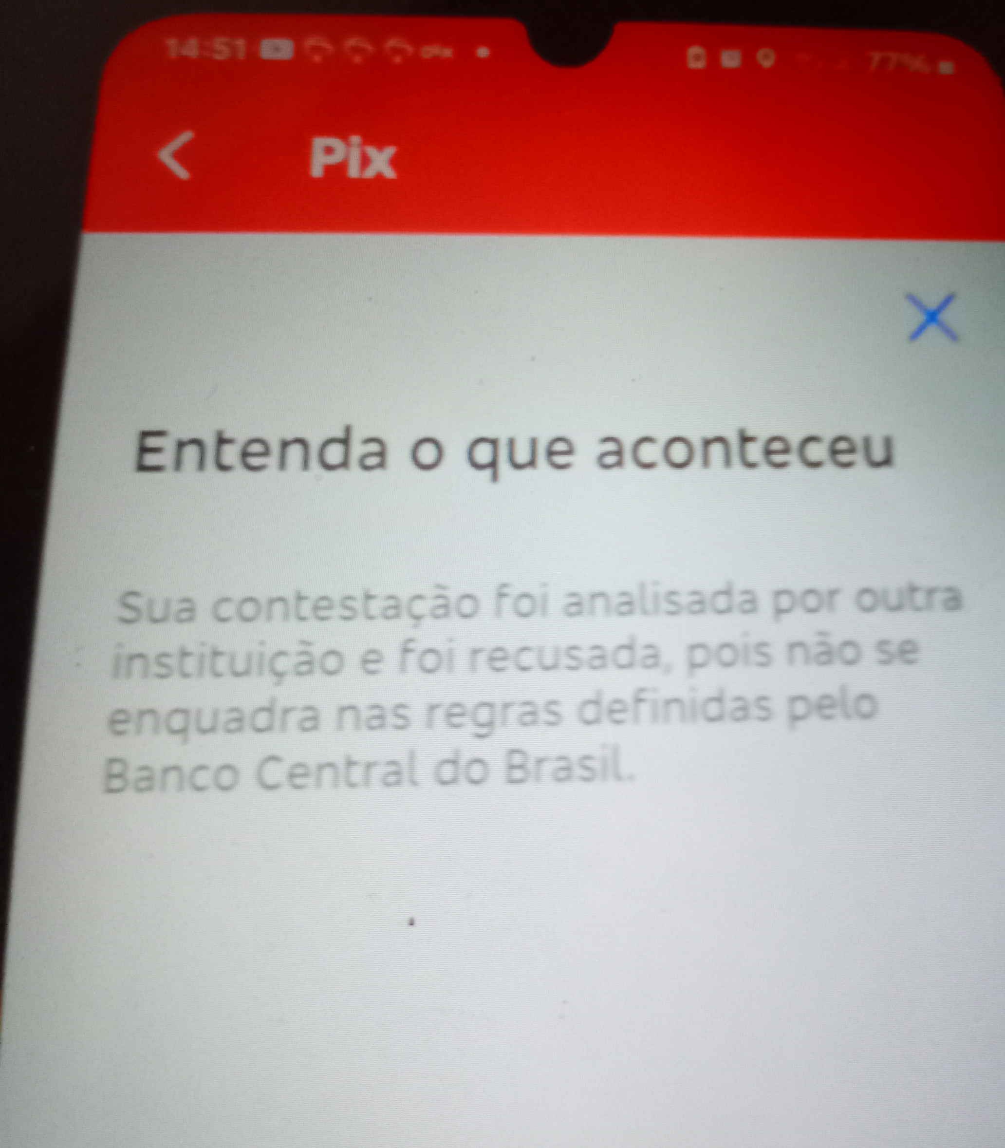 A contestação do pagamento via PIX foi indeferida pelo Banco do Brasil, que alegou não considerar o caso como fraude.